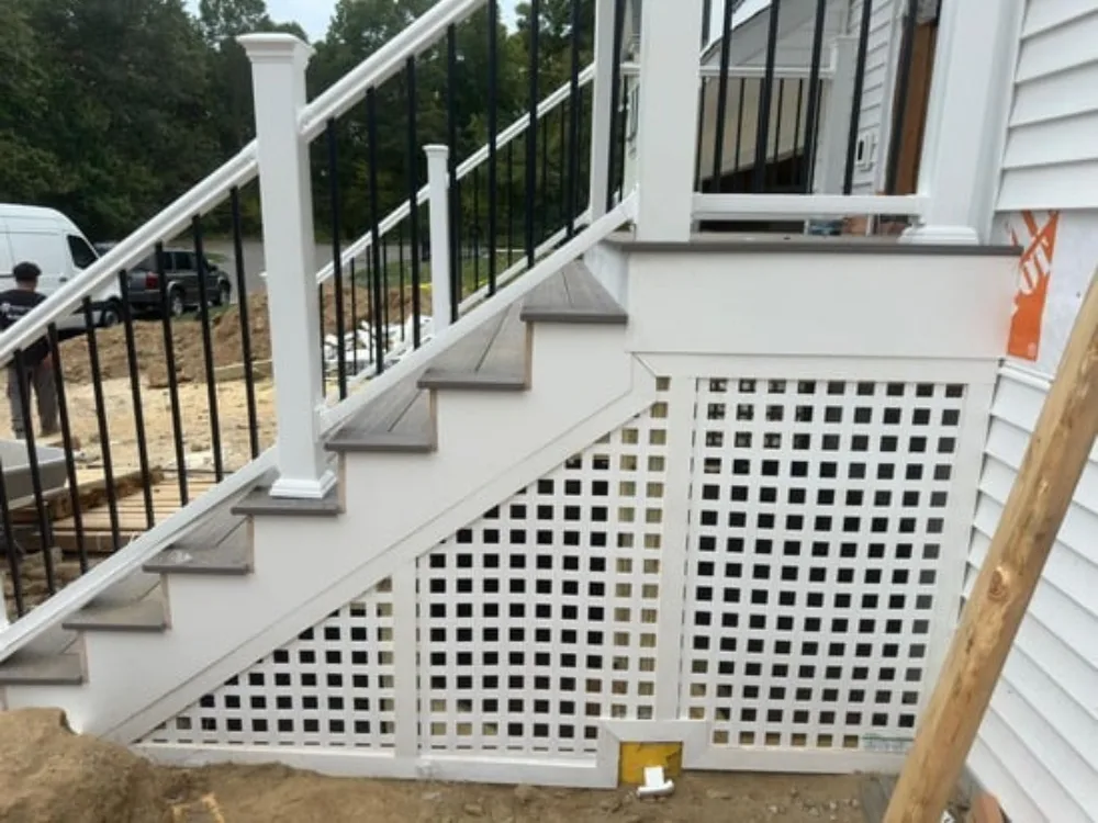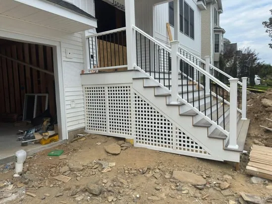 This project involved front porch stair construction, and as a result, the main entryway was structurally built to align with the home’s elevation. Additionally, the work included precise stair framing, secure rail installation, and integrated lattice panels beneath the porch. Throughout the process, transitions between structural elements were carefully executed to ensure stability, proper drainage, and visual consistency with the existing exterior.
