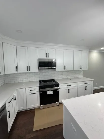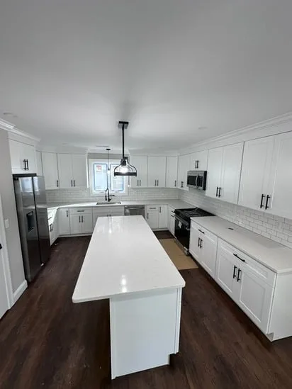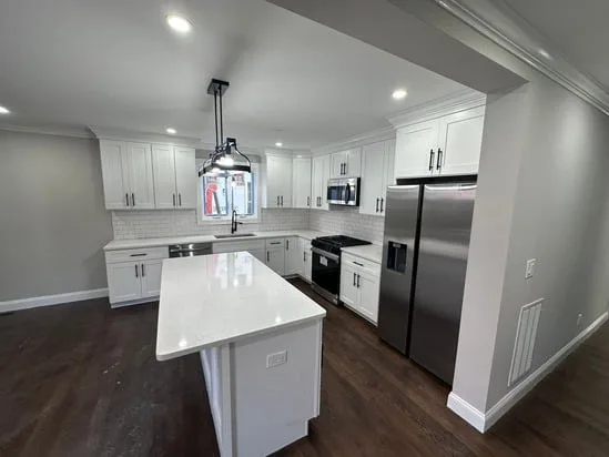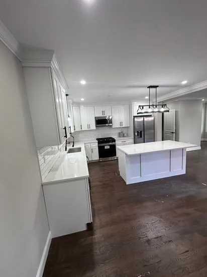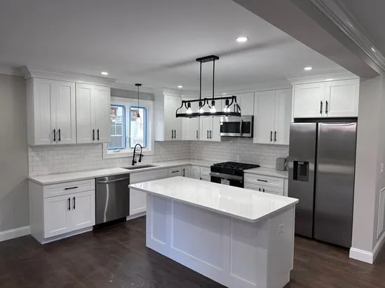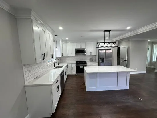 This project involved a full kitchen renovation with custom cabinetry, focusing on improved layout, functionality, and visual consistency. Additionally, the work incorporated seamless transitions between cabinetry, countertops, and flooring, while also enhancing lighting distribution and appliance integration. As a result, the finished space reflects a cohesive, modern kitchen designed for daily use and long-term durability.